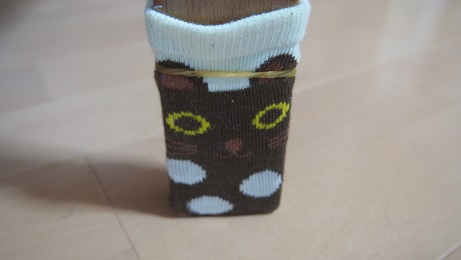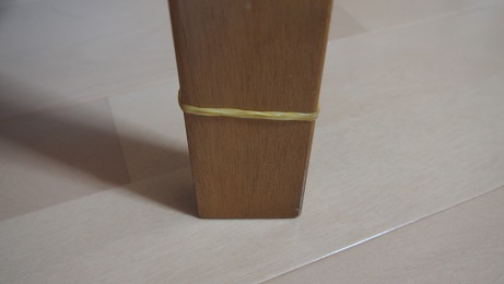 早速、椅子の足に輪ゴムを取り付けて、その上にカバーを取り付けて、さらにいつものように輪ゴムで止めました。